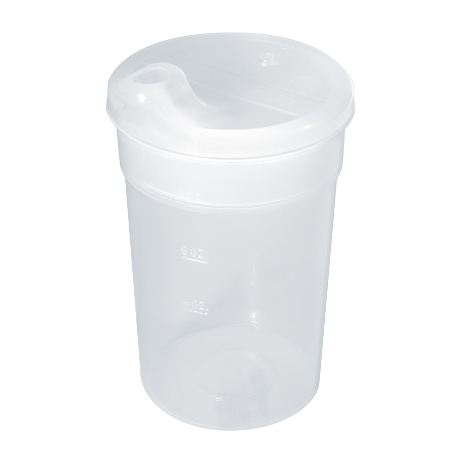 The convalescent cup has a lid with a mouth piece, which has a hole large enough to accommodate a straw. Opposite the mouth piece there is a small air inlet hole in the lid. By putting a finger over the air hole you can regulate the flow of the liquid. 8 oz.