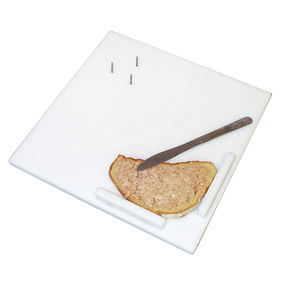 This easily cleaned white food grade polypropylene cutting board has stainless steel spikes to hold food in place for peeling and slicing.