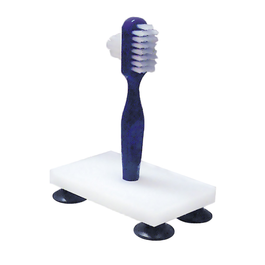 A two sided denture brush mounted securely on 4 suction cups to allow one handed cleaning of dentures.