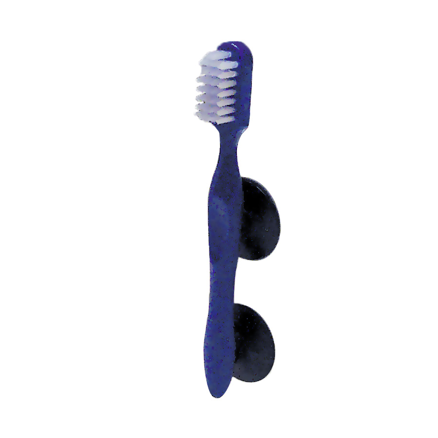 Economy denture brush mounted on 2 suction cups for positioning on the inside wall of the sink.