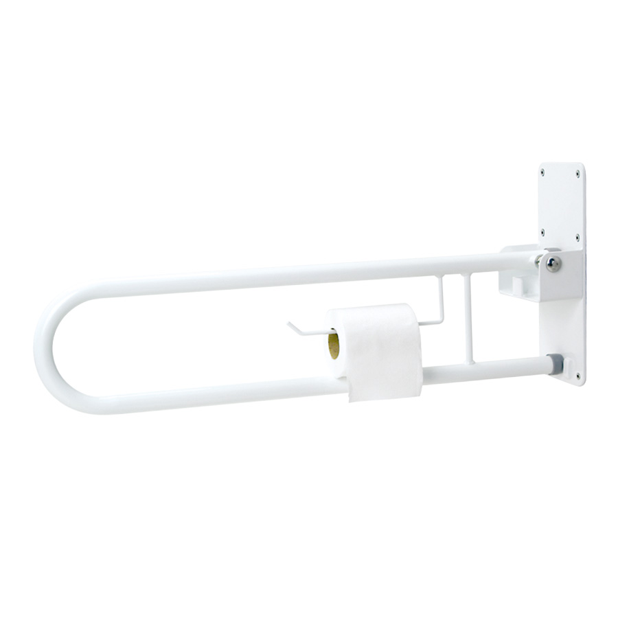This support rail folds up against the wall when not in use. The rail is 28 in long (71 cm) by 1 in (2.5 cm) diameter. It provides a secure grip and the toilet paper holder is attached for convenience. Epoxy coated steel tube. Professional installation is recommended. Weight capacity 200 lb. (95 kg)