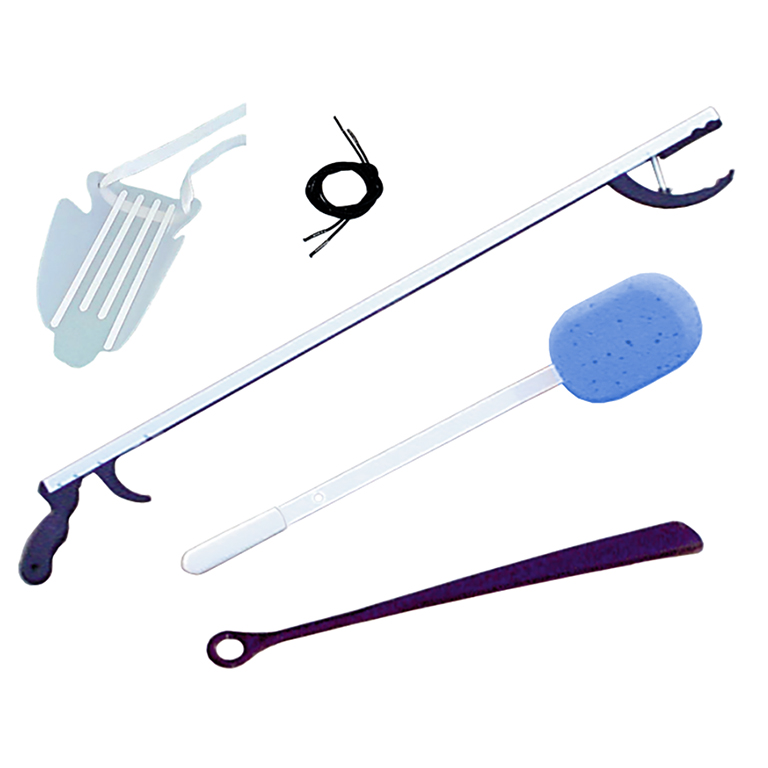 An extensive package for the hip or knee replacement patient. This kit includes six dressing, bathing and household items which are sure to assist in making daily activities easier and more comfortable. All the items included in this kit have been designed to reduce stress on knees and hips.