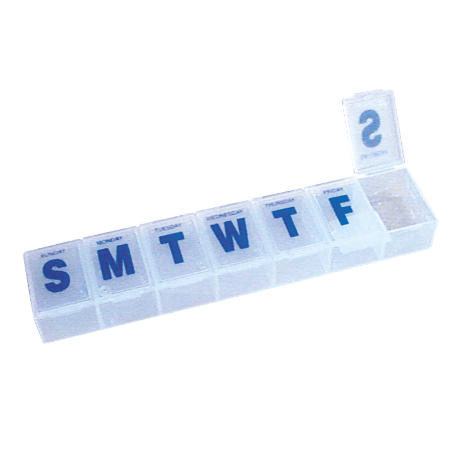 Here is a 7 day pill box for those who need large capacity. Each compartment holds 65 ASA size pills. Brail on lids. L x W x H: 9 x 1.75 x 1 in (23 x 4.4 x 2.5 cm).