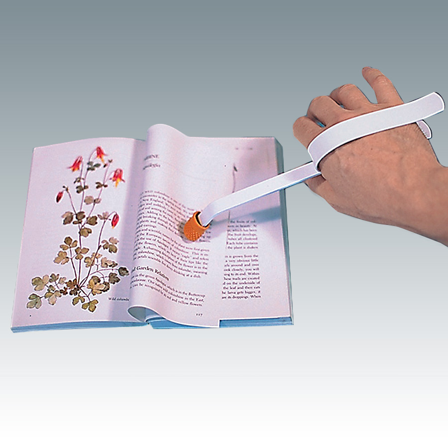 Our hand clip with a long curved light aluminum bar tipped with a rubber end to easily flip pages, even heavy coated paper.