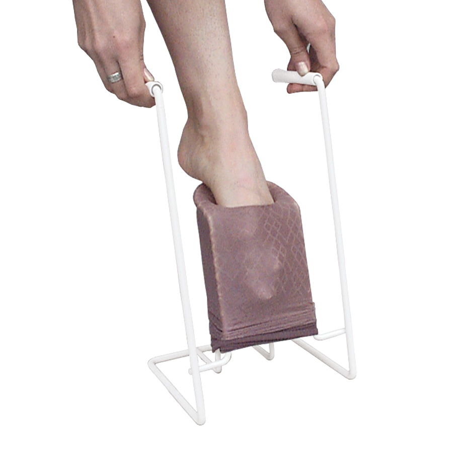 Designed to take the struggle out of putting on compression stockings. Made of steel with smooth plastic coating. Convenient handles greatly assist in pulling the stocking up. Simply stretch the stocking over the column, insert toes and pull up with a continuous motion. Stocking aids reduce bending and increase independence while dressing. An inside column width of 5 in (12.7 cm) combined with a generous angle will accommodate those users with wider calves.