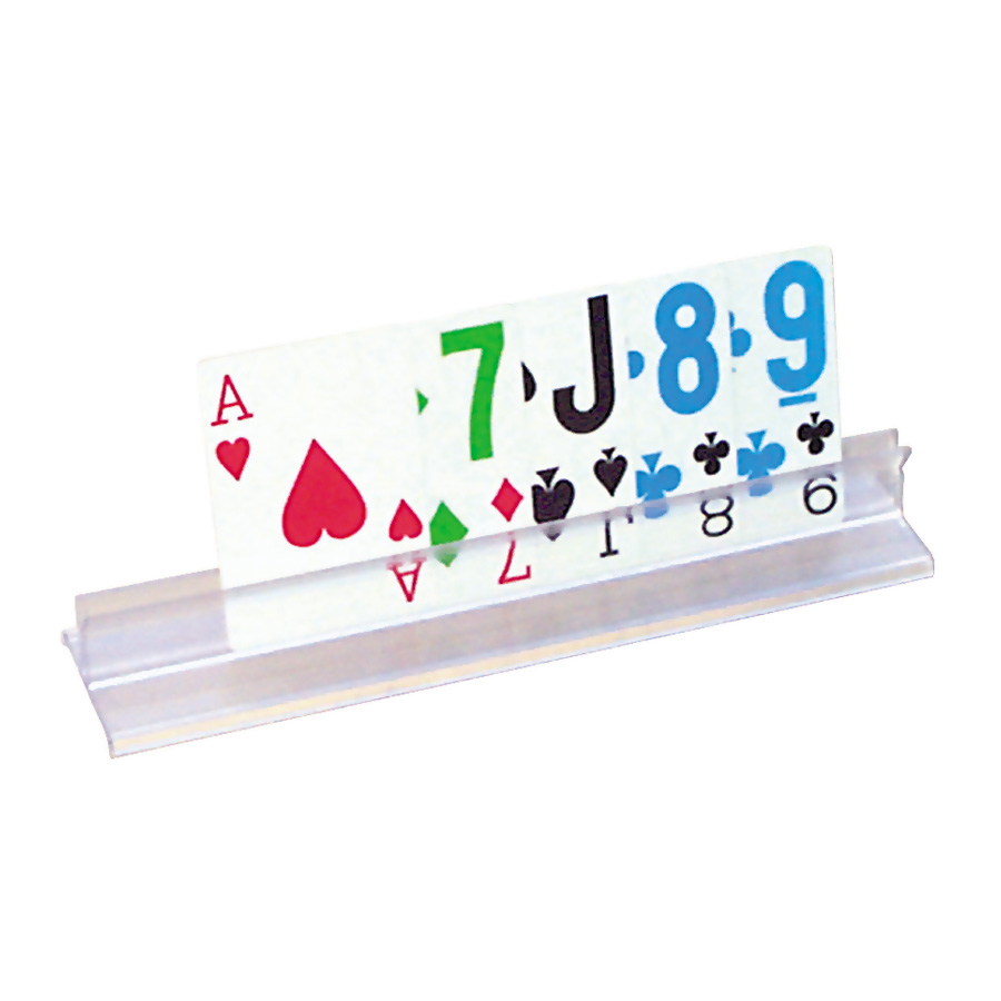 Slotted clear plastic holder keeps playing cards at an angle to improve visibility and provide hands free viewing. Will also hold recipes or memos. 10" (25cm) long. Playing cards not included.