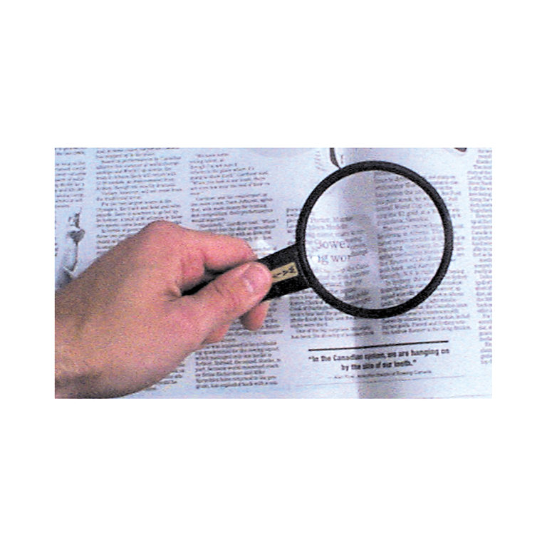 A 3 inch (7.6 cm) round reading glass with plastic handle. 2X magnification, with a 4X bifocal area.