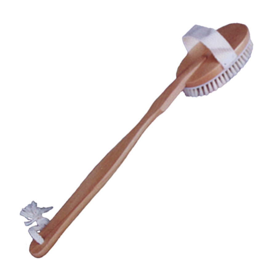 A natural bristle back scrub brush with wooden handle. Brush may be removed from the handle and used as a massage brush or a hand held scrub brush. Length 16.5" (42cm).