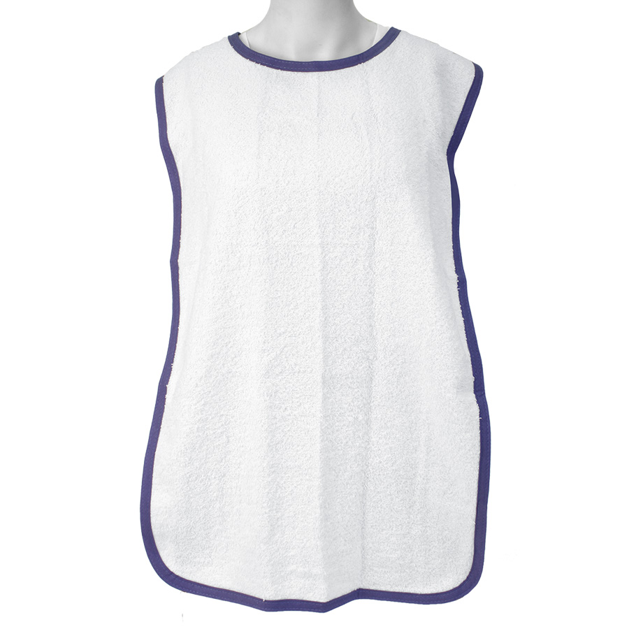 This terry cloth clothing protector features a vinyl backing making it waterproof. Attaches with snaps.