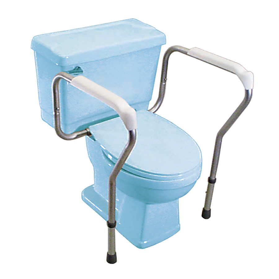 Add extra support to a standard toilet with this anodized aluminum toilet safety frame. The frame attaches under the toilet seat using the hardware already mounted on your toilet. Adjustable height with a range from 25.5 to 29.5 in (65 - 75 cm). The inside arm width is adjustable ranging from 18 to 22 in (46 - 56 cm). The arms are held into the aluminum extruded bracket by push button for easy installation and removal. The arm rests are moulded plastic for added comfort.