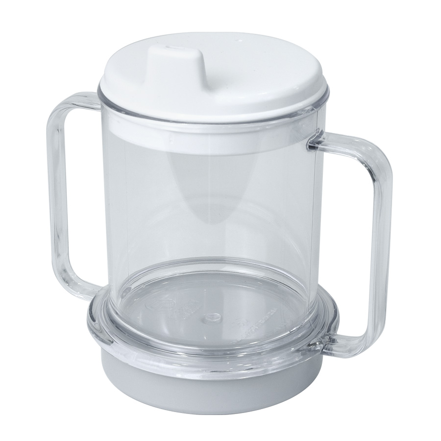 This mug has a weight of 10 oz.(285 g) in its base. The combination of the weighted base and double hand grips makes this an extremely useful device to manage hand tremors. It is transparent to instantly show the level of contents and has a wide base to resist tipping. Do not submerge in water when cleaning this cup. Pat. Pend.