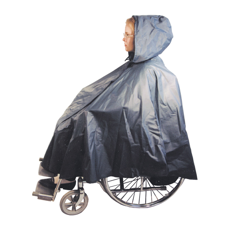 A generous size rain cape to protect the person seated in a wheelchair and the wheelchair as well. Has a Hook & Loop closure that can be opened and closed from the inside as well as the outside, also has a double thickness hood for warmth. One size fits all. Made of 100% nylon - machine washable.