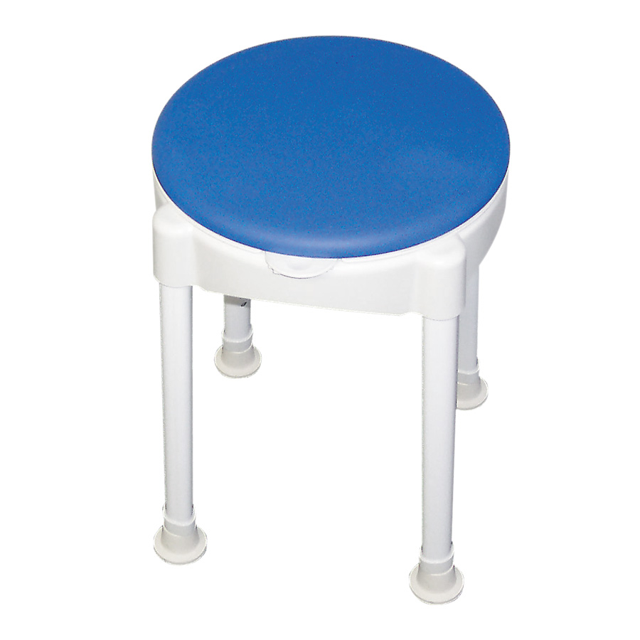 This bath stool makes it easier to move around while bathing. It has removable and height adjustable aluminum legs with suction tips. The round plastic seat has 5 holes for easy cleaning with a soft seat pad for turning. Seat width: 12" (32.5cm). Height adj. 18-25" (45.7-63.5cm). Max. weight: 275 lbs. (125kg).