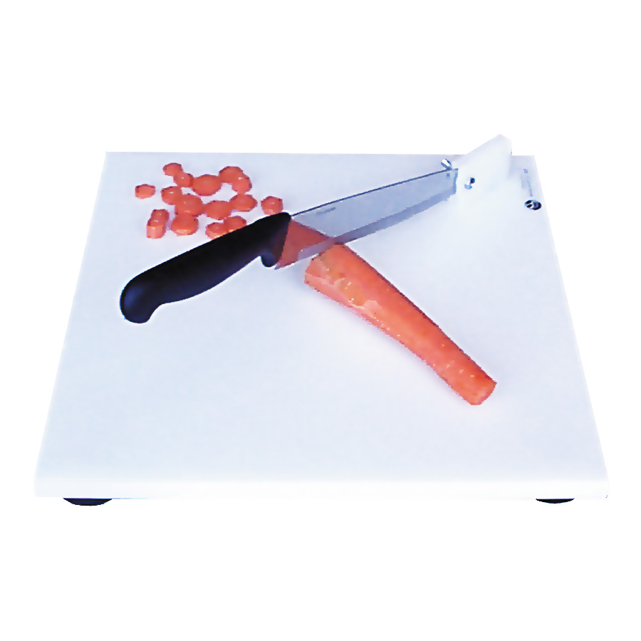 A food grade cutting board with a chef knife attached in such a way that it can be used in a chopping motion through an arc of 90 degrees. The knife has a black plastic handle and can be removed for cleaning and sharpening. The board is mounted on four suction cups.