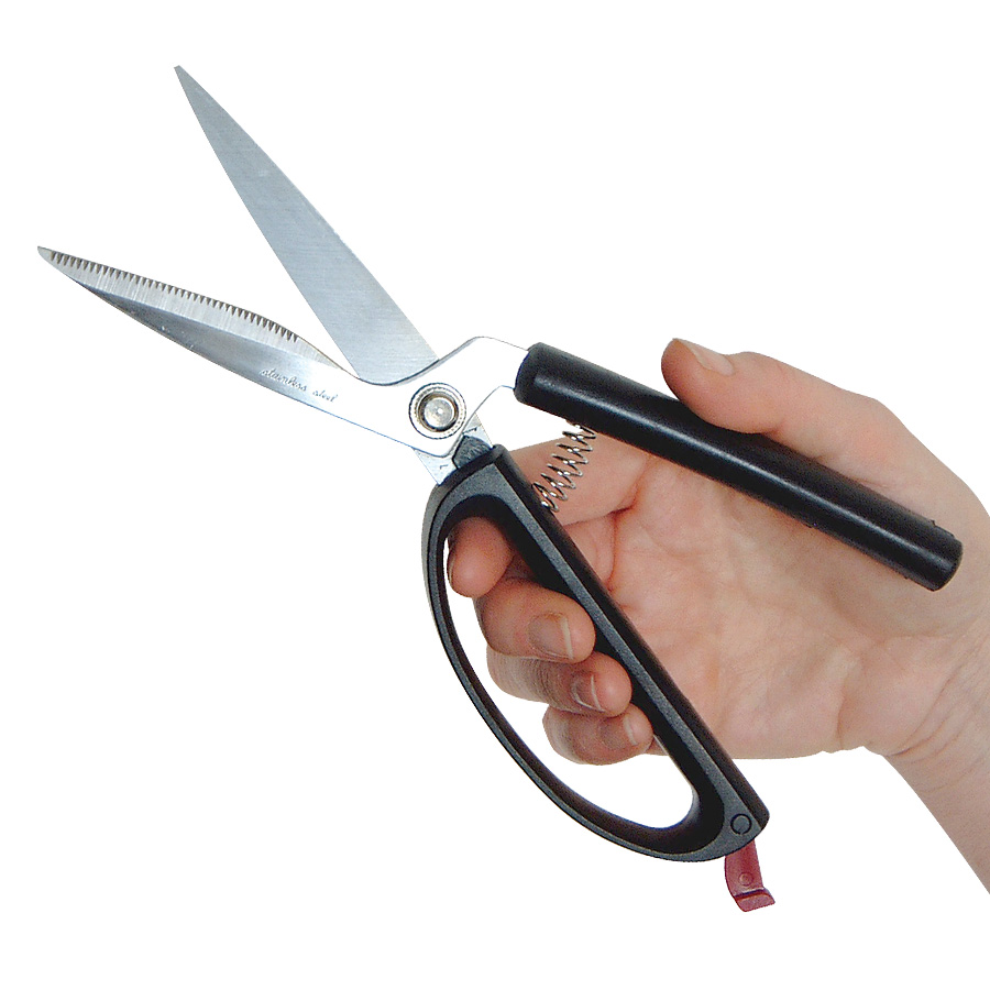 Spring loaded handle opens effortlessly. Loop handle allows for four fingers to fit through in order to utilize full hand strength to operate the scissors. Stainless steel scissor blades for extended lifetime. Left or right hand use. Dishwasher safe. Convenient clip keeps scissors closed.