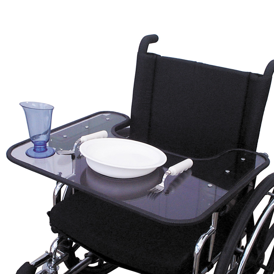 A flat tray made of 1/4 in (0.64 cm) transparent Lexan with a molded edge trim all around the edge. The edge is non marring and wide enough to protect frail skin from abrasion. Mounts with our slide-on system. Fits over the arm rests of 16 and 18 inch (41 and 46 cm) wheelchairs. Tray measures: 18 x 24 in (46 X 61 cm).
