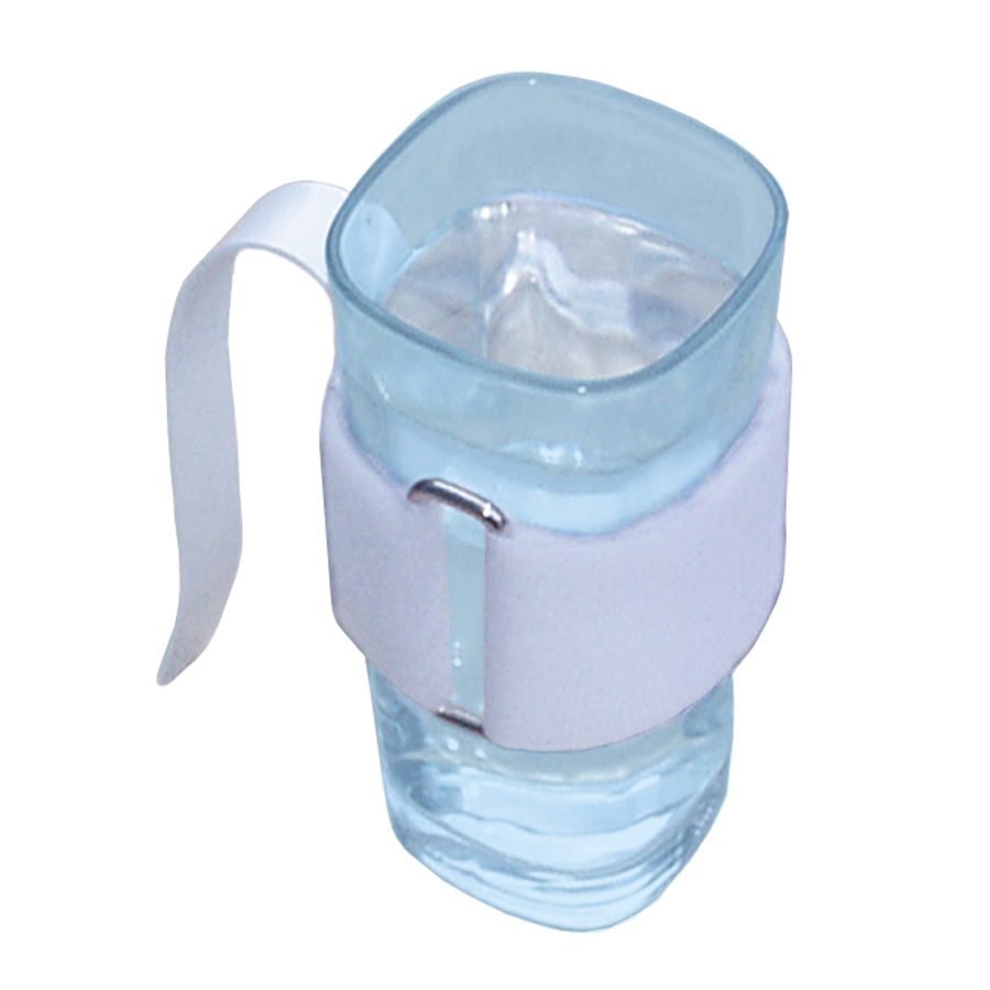 An epoxy coated metal hand clip which fastens to a phone or drinking glass with a Velcro strap. It can be rebent to suit hand size. Also very useful for putting a handle on a salt shaker, a glass, bottles, etc. The velcro is left extra long for adaptations.