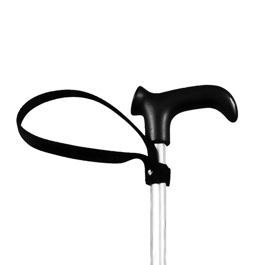 A black wrist strap for a walking cane. Attaches with a Velcror band. Has a soft webbing loop. 1/pkg.
